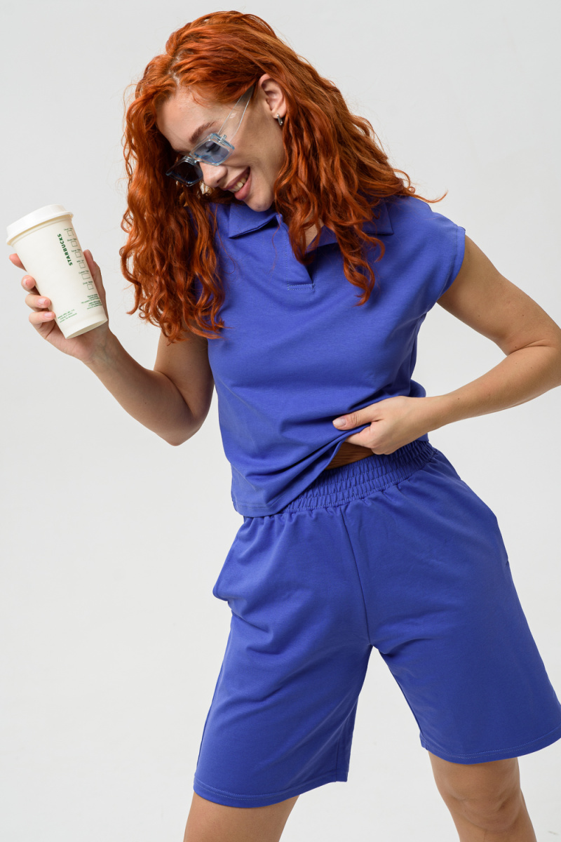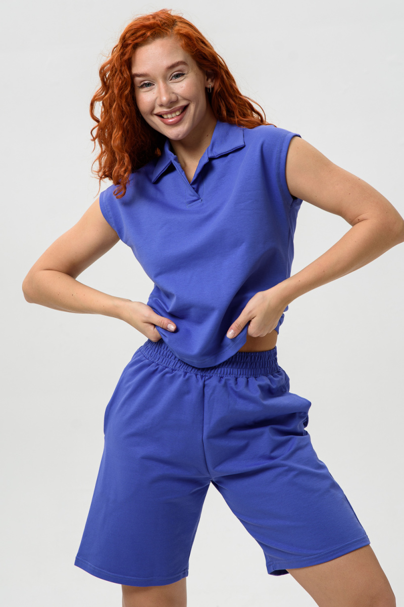 Летний костюм - жилет и шорты. Жилет с воротником "поло" с цельнокроенными подбортами и отстрочкой до линии плеча. Лёгкий лаконичный полуприлегающий жилет со спущенной линией плеча мягко драпируется на линии талии. Шорты с высокой посадкой, пояс прошит на поясной машине. В боковых швах внутренние карманы. Этот стильный костюм подходит для путешествий, прогулок, повседневного использования.
